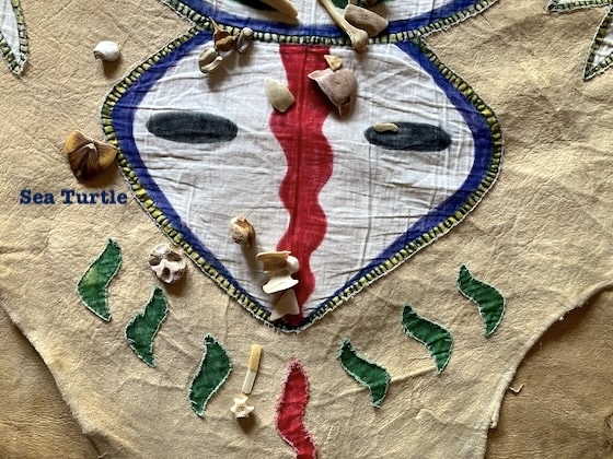 Sea Turtle is sitting outside the left ear in the symbol on the ceremonial hides. Sea Turtle is listening to the unseen dimensions, swimming around in the realms of energy and spirit, exploring the spacious realms where knowledges and ancestors and visions and potentials exist. Sea Turtle landed in the feminine energy field that holds the blueprints and sacred designs for life.